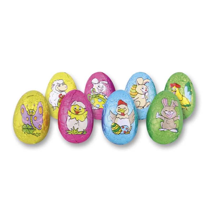 Carton de 170 œufs 12,5G sous alu animaux rigolos chocolat au lait. Pour la chasse aux œufs à Pâques. Hauteur environ 4,8cmCocolatier Français Rohan.