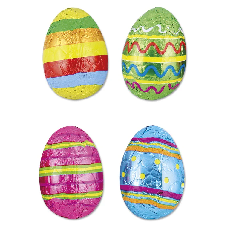 Oeufs 12,5G sous alu grphique chocolat au lait. Pour la chasse aux œufs à Pâques.Carton de 170.Hauteur 5cm diamètre 3,5cm.Chocolatier Français Rohan.