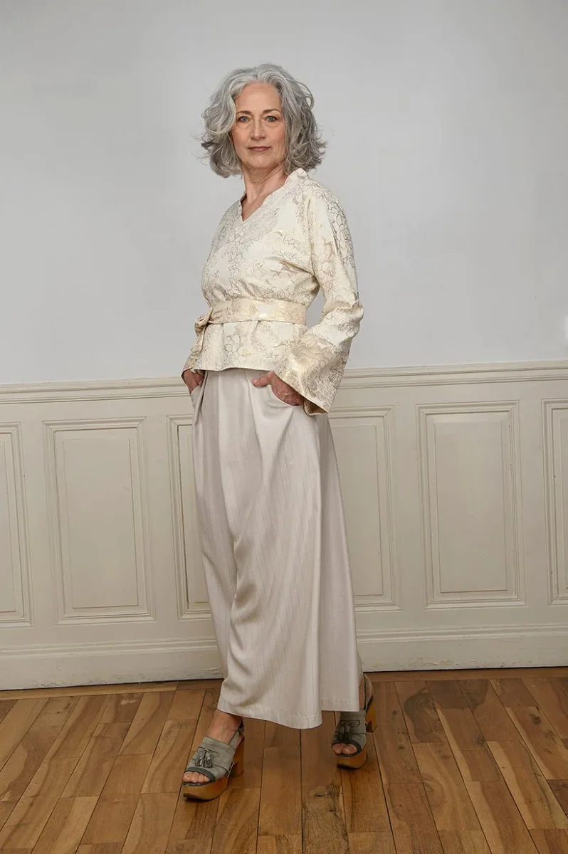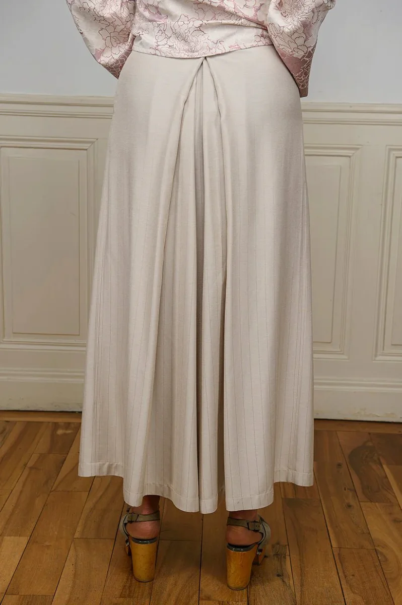 Le pantalon JIMA sable est réalisé dans une toile viscose subtilement rayée de fines lignes satinées ton sur ton. Inspiré du hakama japonais, il offre une coupe fluide et élégante avec une fourche abaissée, garantissant confort et liberté de mouvement.
