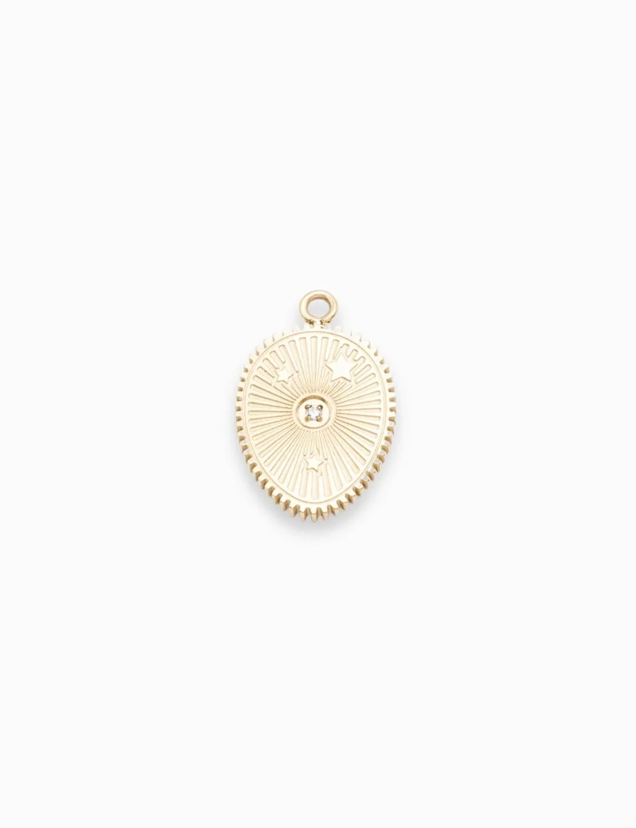 Pendentif à strass en forme ovale à motif étoiles. Dimension : 15 x 10mm L’attache : 1.40mm Matière : Acier inox 304Résistance dorure environ 2 ans