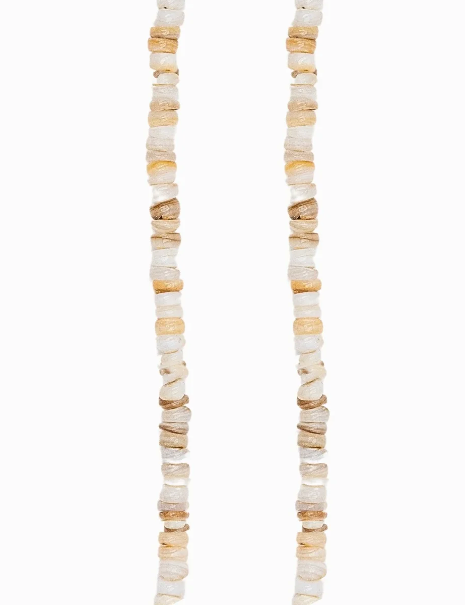 Perles coquillage d’eau douce Diamètre : 6mmLongueur: 38 mmÉpaisseur : 2 mm (variable)Matière : coquillage d’eau douce Vendues par fil de 38 cmChaque perle est unique, peut présenter de légères irrégularités et variation de couleur